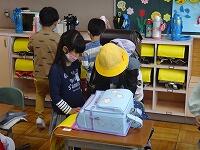 登校班長の中には、1年生を教室まで連れて行き、ランドセルの片付けや名札付け等いろいろなお手伝いをしている児童がたくさんいます。