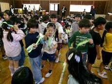 再び、体育館に戻り、1年生へ歓迎のメダルをプレゼントしました。