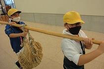 西岩崎取水口を見た後、千本松牧場でバター作りを体験し、那須野が原博物館では、水運びやもっこかつぎなどを体験しました。