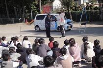 各家庭のアルミ缶を登校時に児童に持ってきてもらい、ある程度集まったら業者の方に運んでもらっています。
