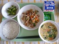 献立:【ふるさとメニュー】ご飯、野菜ふりかけ、牛乳、豚肉のスタミナ焼き、栃木市産黒大豆の枝豆、中華風卵スープ