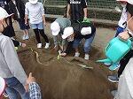 今日は、校庭の砂場を利用して、流水の侵食・運搬・堆積の作用について実験をしていました。