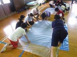 絵や文字を書いて仕上げた後、実際に浮かせてみると、どの班も体育館の天井まで熱気球が上がりました。
