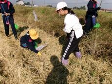 以前、3年生が水辺の生き物調査をした田んぼの稲刈りが終わり、今度は4年生が田んぼの生き物調査に出かけました。