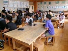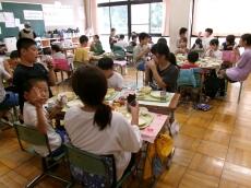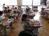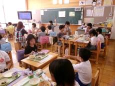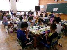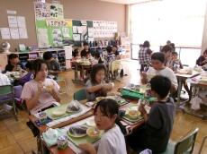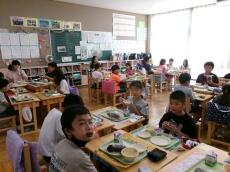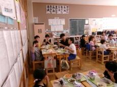 まごころ班での給食を通して、異学年の交流を深め、会食の楽しさに気付いてもらうねらいがあります。子供たちは、久々のなかよし給食で緊張していましたが、しだいに慣れて笑顔も増え、和やかな、まごころランチタイムとなりました。