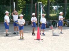ベースボール型ゲームの学習では、投げられたボールを打ち返す運動について、段階を踏んで活動しています。まずはしっかりとボールを捉えられるように、台にくくられた紐にボールを固定した手作り教材を制作して取り組んでいます。