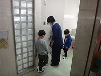 教室で大型テレビを使って、話を聞いた後、実際にトイレに行って、スリッパの並べ方や学校のトイレについて学びました。