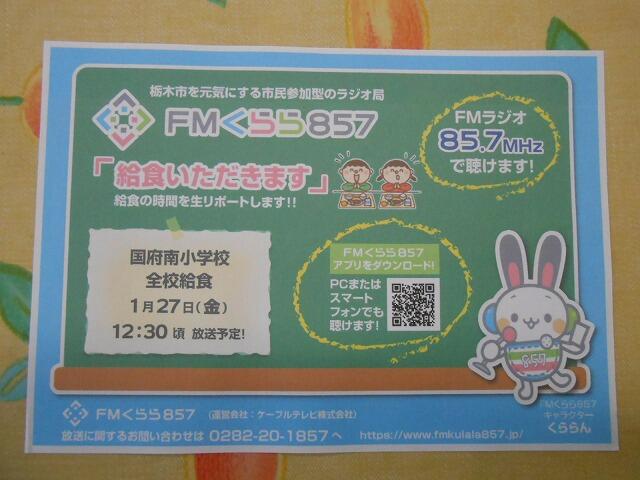 FMくらら857の「給食いただきます」のコーナーに本校が出演します。 日時 平成29年1月27日(金) 12:30頃 放送予定 内容 お誕生給食(1月生まれ) ※給食週間中ですので、給食かるたやリクエスト給食などの話題も出るかと思います。 是非、お聴きください。