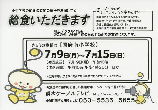 一覧へ お誕生給食がFMくららとケーブルテレビで 投稿日時: 2018/06/28 国府南小管理者 6月28日のお誕生給食の様子がFMくららとCC9(ケーブルテレビ)で放送されます。FMくららは再放送で、7/24(土)の19:00~20:00の前半ケーブルテレビでは7/9~7/15に放映されます。詳しくは下記のチラシの写真をご覧ください。