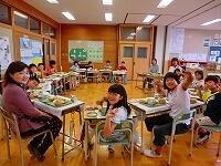 3月6日(木)に、ふれあい広場で、6年生とのお別れ全校給食を行いました。なかよし班で6年生と給食を食べるのは、これが最後です。どの班も楽しそうに食べていました。