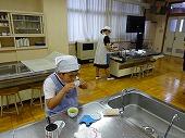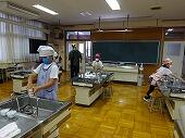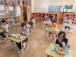 今日は1年生初めての給食でした。きれいに手を洗って、上手に白衣に着替えます。今日はみんな大好きなカレーだったのでモリモリ食べていました。