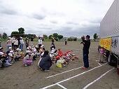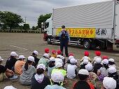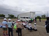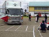 今日は交通安全教室を行いました。トラック協会のみなさんにご協力いただき、巻き込みや飛び出し事故の防止のために実験を見せていただきました。