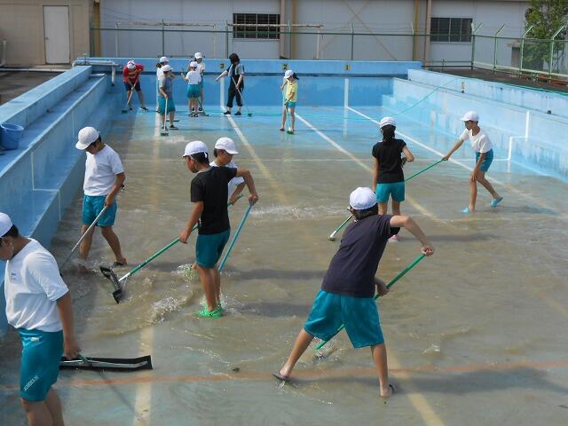 約1時間半の作業で、プールの中の汚れを洗い流しました。また、プールサイドや更衣室もきれいにしました。きれいになったプールでの水泳授業が楽しみです。