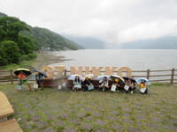 中禅寺湖畔では、G7記念モニュメントの前で記念写真。水位が50cm下がっていることもあり、水辺の散策もしました。