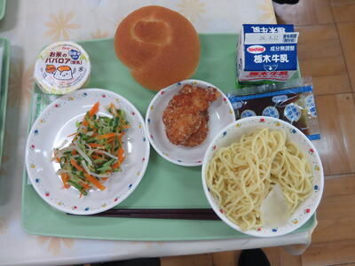 今日のメニューは、ごはん、牛乳、ポークカレー、キャベツとコーンのソテー、フルーツヨーグルトでした。