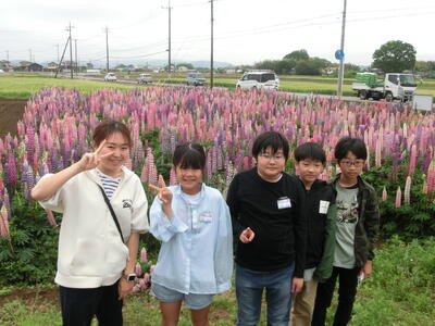 満開を迎えているルピナスの前で、記念写真を撮り、学年農園の草取りの予定でした。