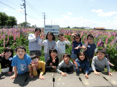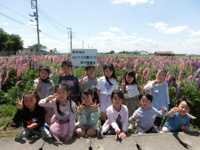 青空の下、ルピナスも子どもたちの笑顔も輝いています!