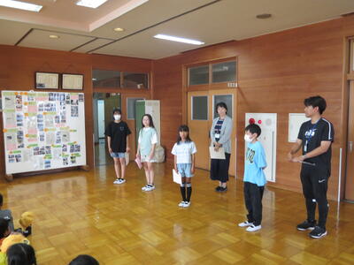 はじめに、1年生が全校生の前で、自分の名前を大きな声で自己紹介しました。