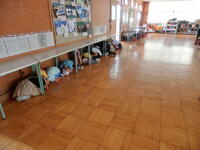 竜巻がきてしまった場合、子どもたちは、窓からはなれ、「だんごむし」の姿勢をとります。