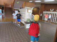 毎朝、昇降口では担当職員が登校してくる子ども達を迎え、お互いあいさつを交わします。