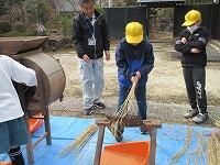 最後に、大平町にある「おおひら郷土資料館(戸長屋敷)」に行って、農家の家のつくりを見たり昔の道具を体験したりしました。