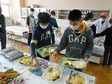 今日は6年生が卒業を祝ってバイキング給食をしました。初めに取るメニューはカロリーを考えて選びますが、その後は好きなメニューを食べることができました。いつもとは違う給食に6年生も大喜びでした。