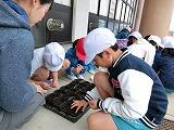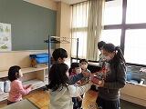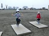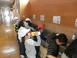 今日はあいにくの天気ですが、子どもたちは外に出て遊んでいました。1年生は校内でだるま落としやあやとりを上級生に教えてもらいながら遊んでいました。