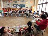 今日は6年生が3・4年生と一緒に給食を食べました。黒板には「6年生ありがとう」のメッセージがありました。楽しくおしゃべりをしながら食べていました。