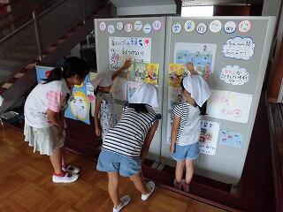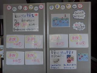 昇降口前にプール学習での注意について掲示をしました。楽しいプール学習でも危険はたくさん潜んでいます。子どもたちは考えながら見ていました。