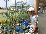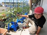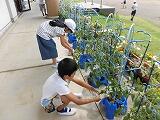 2年生の育てているミニトマトがどんどん大きくなっています。実がたくさんついていて、赤くなるのが楽しみです。水やりも頑張っています。