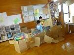 今日は1年生が算数の勉強で箱を高く積み上げていました。どんな風にすると高く積めるか工夫しながらグループごとに作業していました。