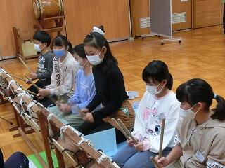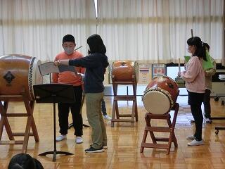 音楽部で国庁太鼓の練習が始まっています。4年生も先輩のまねをしながら練習しています。