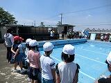 今日はプール開きを行いました。4~6年生が掃除をしてくれたので、とてもきれいになりました。みんなで誓いの言葉を読み上げて、安全に楽しく活動できるように確認しました。