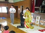 県立博物館の展示品が国府南小学校体育館に移動してきました。今日は、全体説明があり、その中で6年藤野さんが十二単を、6年膝附くんが鎧を身につけました。その後、希望者全員がそれぞれを身につけ、歴史の一端を体感しました。