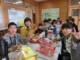 10月19日(土)の自由参観日(オープンスクール)に、6つの地区別に親子ふれあい給食を行いました。児童・保護者等合わせて約90名の参加者になりました。中学生も来てくれました。おうちの人が作ってくれたお弁当はおいしかったです。