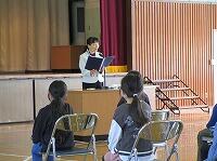 新任式では、4人の先生方をお迎えしました。6年生の代表児童は、「お迎えの言葉」の中で「今から先生方と過ごせるのを楽しみにしています。」と発表しました。