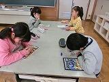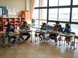 今日は雨の日だったので、休み時間も教室で過ごしていました。1・2年生は積み木やこま遊び、5年生はお絵かきクイズをしていました。