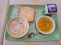 鶏肉と野菜のクリーム煮、シュガートースト、マスカットのジュレポンチ、牛乳