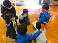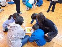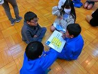 この日、オープンタイムにふれあい広場で全児童が集まり、「給食集会」が行われました。4人の先生が役割分担して寸劇を行いました。みんな興味津々、女の子が卵を食べると体の具合が悪くなること、野菜が嫌いで食べられないこと、などを聞いて、食べてはいけないものとちゃんと食べたほうがよいものを区別する話合いをしました。話合いは、いつものとおり縦割り班で行い、班長がみんなの前でまとめを発表しました。みんな、よく話し合って、食物アレルギーのことについてよく分かりましたね。