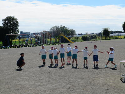 休み時間、校庭で3年生が手をつないで下を向いていました。