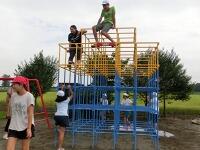 なかよしタイムで、異学年のなかよし班で遊びました。朝、雨が降って校庭にはたくさんの水たまりができていましたが、水はけのよい校庭で、遊ぶ頃にはすっかり乾いていました。ドッジボール、高おに、ブランコタッチおにで、どの班も盛り上がっていました。