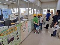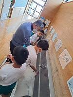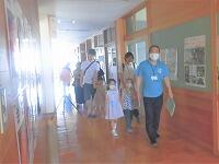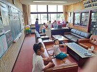 この日、1年生は、2年生と一緒に学校探検をしました。校長室に来た2年生は、校長先生に質問したりたくさんある写真を調べたりしていました。職員室に来た1年生は、初めて見るものばかりで目を輝かせていました。