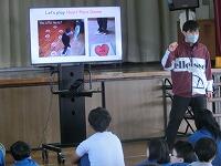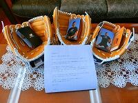 最後に、大谷翔平選手から贈られたグローブの披露がありました。野球をしている2人が代表して手にはめた感想を発表してくれました。グローブは、このあと、各教室を回ってみんなで手に取ってゆっくり見てもらいました。