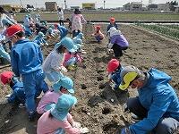 この日、本校1年生が市有バスに乗って、けやき保育園を訪問しました。今までなかった初めての交流です。けやき保育園では、種芋をたくさん用意して、また畑を耕して芋を植えやすいよううね、穴を作っていただくなど、十分な準備をしていただき活動をすることができました。園児と一緒に植えたジャガイモ、6月にまた交流しに行って、掘らせていただきます。たくさんできるのが、今から楽しみですね。園の皆様には、ご準備大変ありがとうございました。
