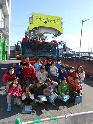 消防士さんの仕事について説明を受けた後、いろいろな消防車を見せてもらいました。また、はしご車にも乗せてもらいました。今月から新しいはしご車が入ったということでしたが、乗ったのは古い方でした。とても高いところまで行って、遠くの筑波山までよく見えました。