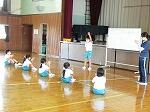 今日の表現運動では「エビカニビクス」で体を動かしました。子どもたちは幼稚園や保育園でおどったことのある子が多く、思い出しながら音楽に合わせて運動しました。