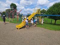 この日は、前半が全校で「いろおに」、後半は全校で「ドッジボール」をしました。滑り台に集まって「黄色」をさわっておにに捕まるのを防いでいます。でも本当は、「きいろ」ではなく、「きんいろ」。この後大騒ぎでみんな逃げ出しました。後半のドッジボールは、上級生が下級生にボールを譲るなど、微笑ましい光景が見られました。最後に、各学年から一人ずつ感想を発表しました。