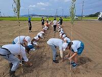 道を西に渡ったところにある畑。全員集合で、地域の皆さんの紹介や蒔き方の説明がありました。