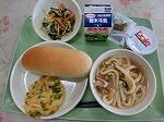 9月28日(月) コッペパン、いちごジャム、かきあげうどん、ほうれん草ともやしのごま和え、ヨーグルト、牛乳