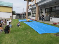 まずは、体と心を目覚めさせるストレッチを行い、その後は、なかよし班で、フラフープリレー。